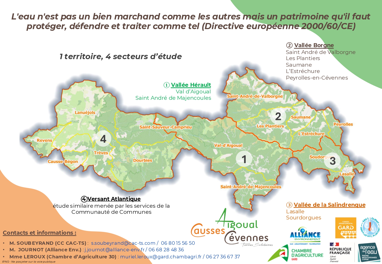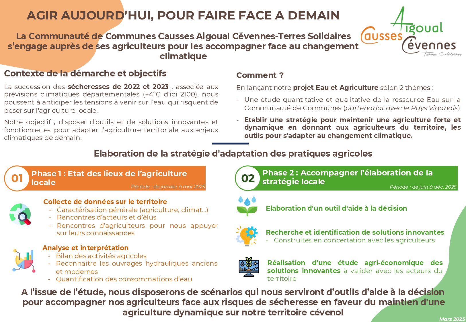 L’étude commence par un état des lieux détaillé de l’agriculture et de son utilisation en eau sur le territoire de la Communauté de Communes Causses Aigoual Cévennes. Cette phase s’appuie sur les données existantes et sera conduite en collaboration étroite avec les partenaires locaux ainsi qu’en concertation avec l’ensemble des acteurs agricoles du territoire (producteurs d’oignons doux, éleveurs, maraîchers, apiculteurs, etc.).