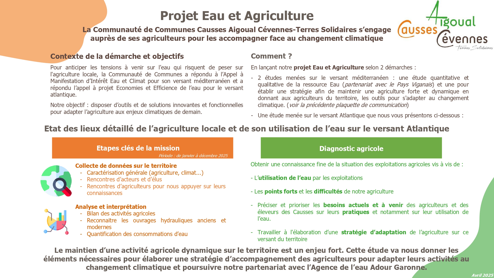 Cet état des lieux détaillé de l’agriculture locale et de son utilisation de l’eau vise à acquérir une connaissance fine de la situation des exploitations agricoles, à identifier leurs pratiques en matière d’usage de la ressource en eau, ainsi qu’à mieux comprendre les atouts et les difficultés rencontrées par les agriculteurs et éleveurs des Causses. Il permettra également de préciser et de hiérarchiser leurs besoins actuels et futurs en matière d’adaptation des pratiques agricoles.